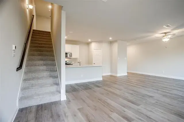 Inside, an open-concept main level sets the stage for effortless living and entertaining. Durable luxury vinyl plank flooring guides you into a chef-inspired kitchen with an oversized island, stainless steel appliances, custom-painted cabinetry, granite countertops, and a spacious pantry. The adjoining living area provides a comfortable space to unwind or host friends, while a conveniently placed powder bath adds daily practicality.