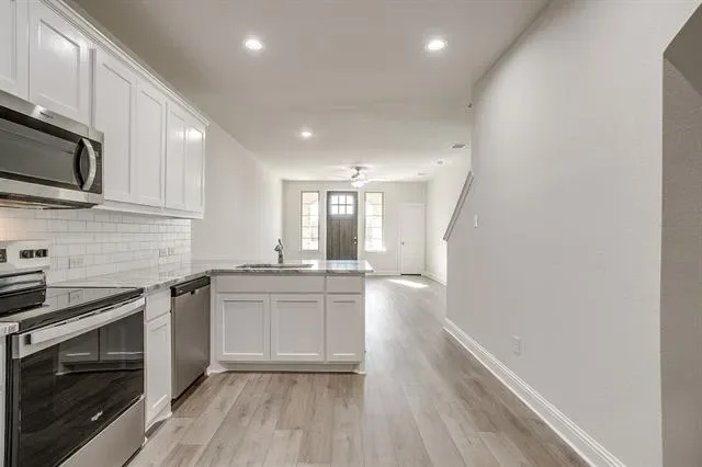 Step into refined living at this beautifully designed townhome in Knight’s Landing on Eden Rd., where modern style meets every day ease. From the classic brick-and-stone exterior and bold 8-foot Craftsman-style front door to the rear-entry two-car garage, this home exudes timeless charm and curb appeal.