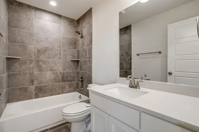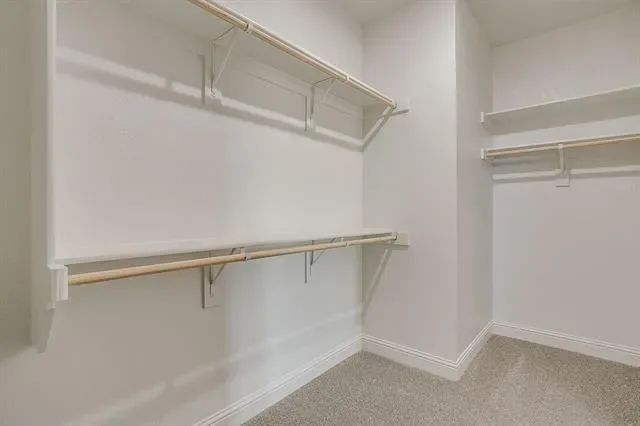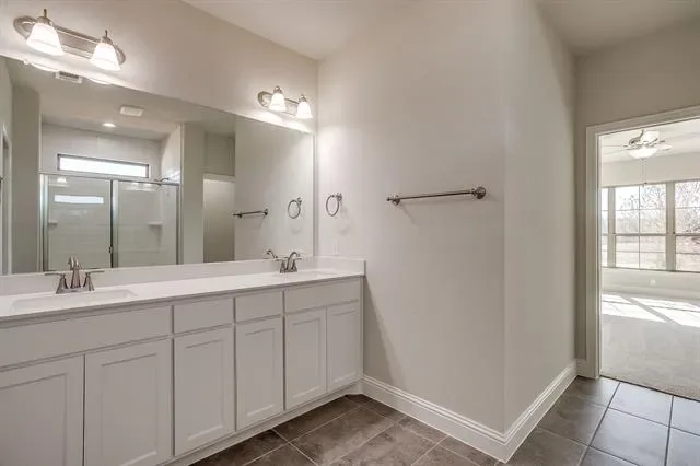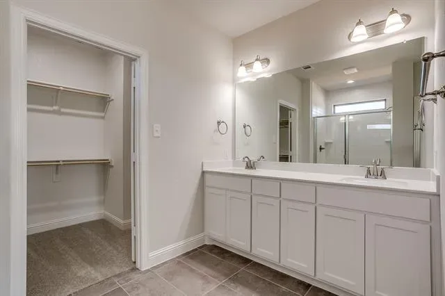 The private first-floor primary suite offers a peaceful escape, complete with a dual vanity, striking 12×24 tile detailing, a large glass-enclosed shower, and an expansive walk-in closet.