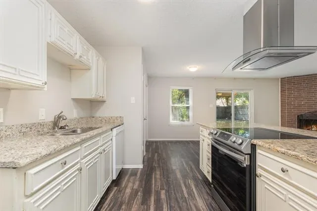 Inside, discover an inviting open-floorplan layout where the living room, kitchen, and breakfast area flow seamlessly together. The kitchen features a stylish slide-in smooth-top stainless steel range nestled within a functional island, topped by a modern stainless steel and glass range hood that adds a sleek contemporary touch. A cozy cornered brick veneer fireplace anchors the living space, creating a warm focal point.