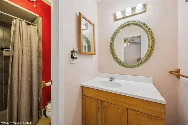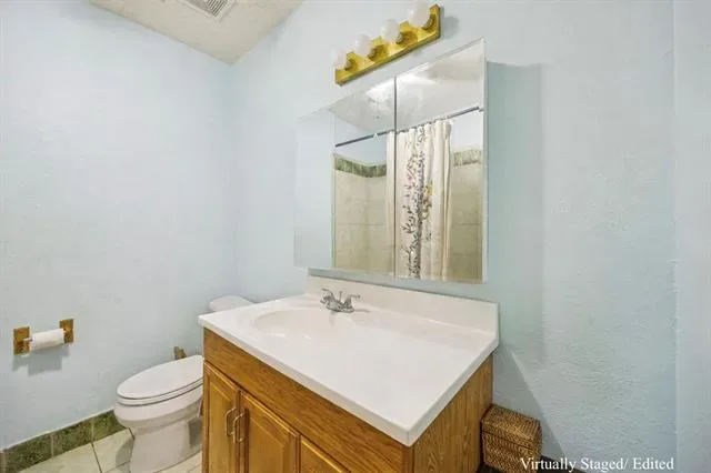 The primary suite includes a private bath with a walk-in shower, and the secondary bedrooms offer flexible use for guests, a home office, or additional living space. The living area flows into a functional kitchen with plenty of cabinet storage and an adjacent dining space.