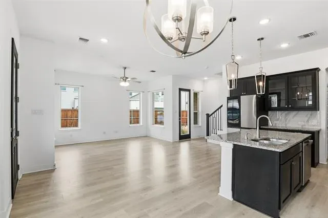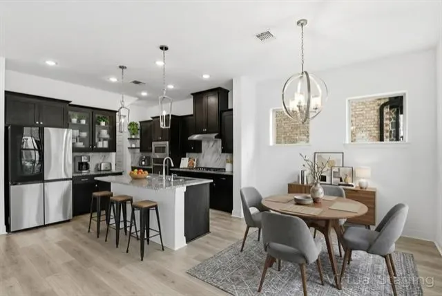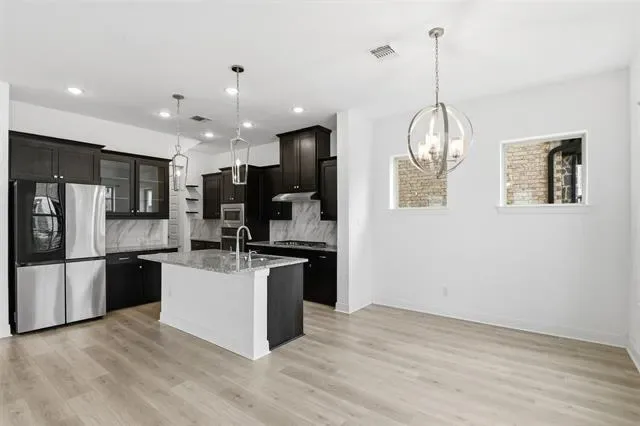 Step inside to a bright, open-concept layout with beautiful luxury plank flooring, ideal for modern living. The chef-inspired kitchen features rich dark cabinetry, granite countertops, a generous walk-in pantry, and a large center island with breakfast bar — perfect for entertaining. All major appliances convey, including a sleek four-door refrigerator, making this home truly move-in ready.