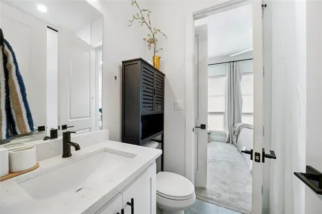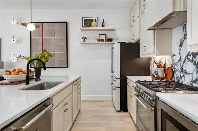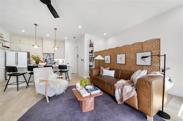 The chef’s kitchen is a true showpiece, featuring quartz countertops, a striking marble backsplash, designer vent hood, and top-of-the-line Bertazzoni appliances. A large center island anchors the space, seamlessly connecting to the spacious living and dining areas, which open to a private balcony—perfect for indoor-outdoor living. The home offers two balconies, including an impressive rooftop balcony ideal for entertaining or enjoying city views.