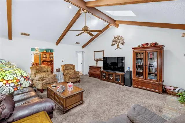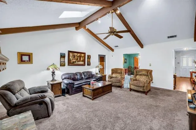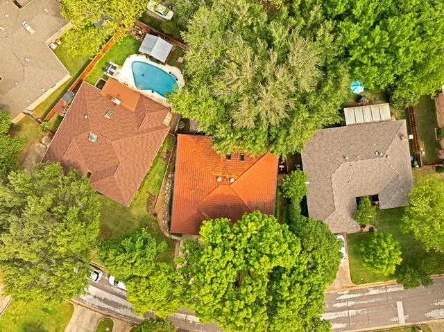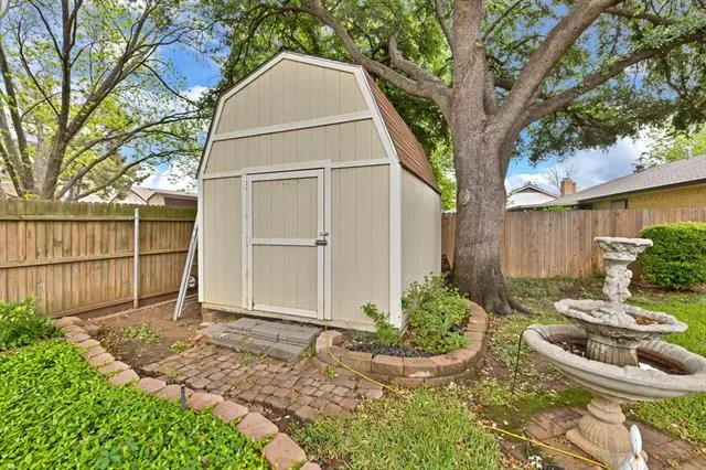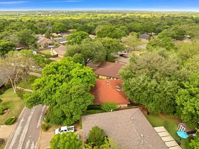 Located in a highly desirable, established neighborhood, this charming brick home is surrounded by mature trees and timeless character. Inside, you’ll find real hardwood flooring, tile, and carpet throughout, along with a beautifully updated kitchen featuring granite countertops, abundant cabinetry, bright lighting, stainless steel refrigerator, built-in microwave, and stylish tile flooring. The main living area is filled with natural light thanks to skylights and accented with warm wood beams. A cozy wood-burning fireplace also adaptable for propane adds comfort on winter days. The home has been exceptionally well maintained, reflecting the pride of ownership. The spacious primary bedroom includes a large walk-in closet and a full ensuite bath with an updated separate shower. Additional bedrooms offer generous closet space and ceiling fans. Major upgrades include a durable metal terracotta-style roof with a 50-year warranty and newer windows. A standout feature is the gorgeous covered patio, complete with large windows and lovely tile flooring perfect for relaxing or hosting gatherings year round. The property also includes a two-car garage and a seperate utility room with a washer and dryer. Situated close to schools, restaurants, shopping, DFW Airport, museums, and countless activities, this home offers both convenience and charm in an unbeatable location.