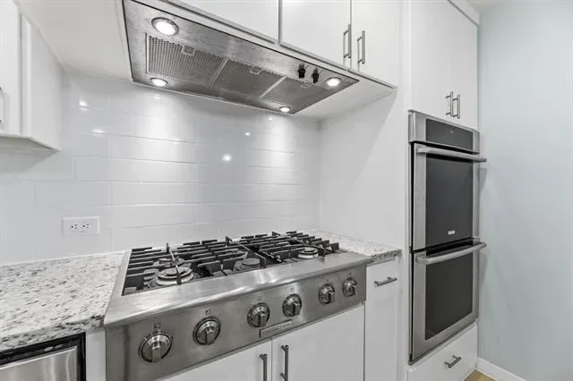 The kitchen is equipped with granite countertops, a built-in stainless steel double oven, 6-burner cooktop, and a built-in cabinet for a microwave, providing both style and functionality. Additional exterior improvements include a new fence with metal gates and brand new siding.
