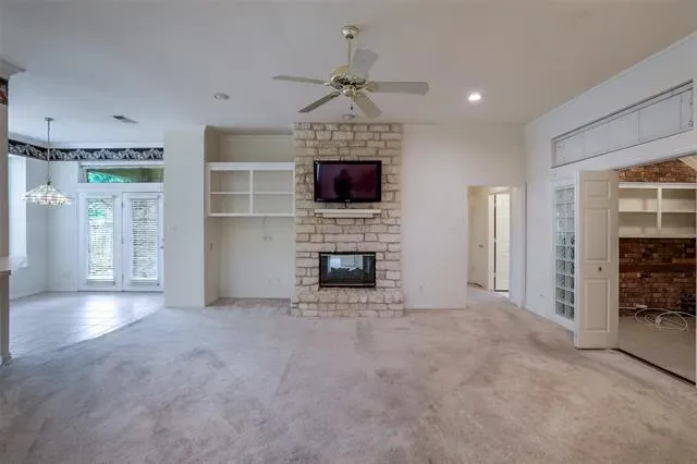Welcome to this beautifully maintained garden home in the highly sought-after Oak Lake Community. Designed with both comfort and functionality in mind, this home features an inviting open floor plan with a formal dining area and a bright breakfast nook highlighted by charming bay windows and a built-in desk that is perfect for work or daily organization. Open concept living area features a bright kitchen with ample cabinet space and great natural light. The spacious living area offers a cozy gas log fireplace, which is mirrored in the serene primary suite that also includes a generous walk-in closet. A secondary bedroom with a cedar closet and a versatile bonus room provide flexible space for a home office, hobby room, or guest retreat. Enjoy the convenience of a well-appointed laundry room with built in storage and folding space. Step outside to a covered patio and a beautifully landscaped backyard ideal for relaxing or entertaining. Recent updates include a new HVAC system installed in July 2025, which offers peace of mind and energy efficiency for years to come. Residents of Oak Lake enjoy low-maintenance living with HOA-covered front lawn care, as well as access to a community lake, pool, clubhouse, and tennis courts. With peaceful sidewalks throughout, this neighborhood is perfect for evening strolls and a true sense of community. This is more than a home- it’s a lifestyle you’ll love coming home to.