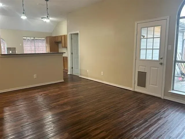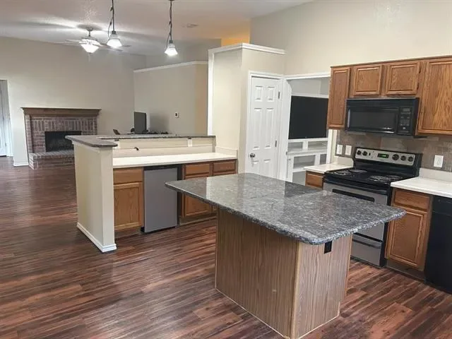 Welcome to this beautifully updated 3-bedroom, 2-bath brick home with a 2-car garage, located in a well-established neighborhood. This move-in ready property features a brand-new roof, new carpet, and fresh paint throughout. The functional floor plan offers two spacious living areas, ideal for both everyday living and entertaining. The kitchen includes an island, a dine-in area, and an over-the-counter serving bar, providing ample space for gathering and convenience. The primary suite features a garden tub, creating a relaxing retreat. The main living area is enhanced by a brick wood-burning fireplace, adding warmth and character. A built-in entertainment system.The backyard offers a tiled patio, mature trees, and a raised planter, along with a generous yard space. A gate provides direct access to an expansive field behind the property, offering additional open space. A pet door with cover is installed in the back door for added convenience. Conveniently located with easy access to I-20 and Highway 360, this home is just minutes from Arlington Highlands, providing a variety of shopping, dining, and entertainment options. Seller(s) offer up to $5k in Closing Cost with accepted offer. Occupied Until April 18.