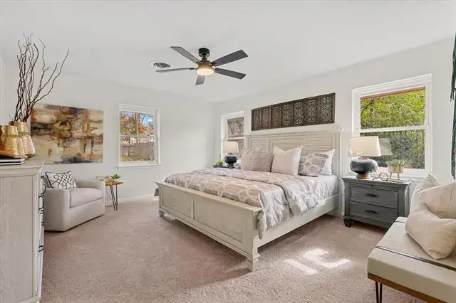 Bedrooms are generously sized with new carpet and ceiling fans. Bathrooms have been fully renovated with modern finishes. Enjoy a spacious backyard with mature trees, a covered patio, and pergola—perfect for relaxing or entertaining.