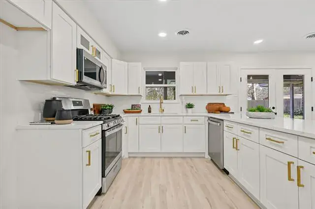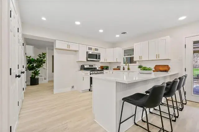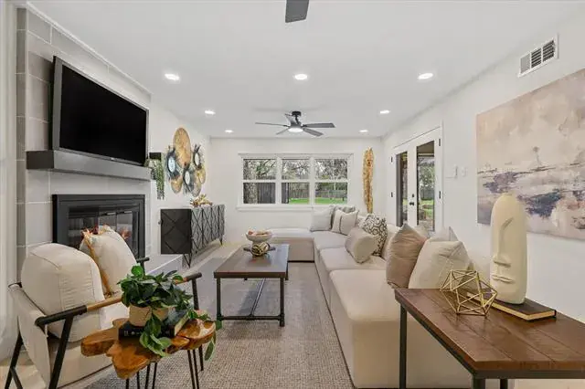 Inside features luxury vinyl plank flooring, recessed lighting, and a functional open layout. The updated kitchen includes white shaker cabinets, quartz countertops, a large island, stainless steel appliances, and a gas range. The living area centers around a fireplace with abundant natural light.