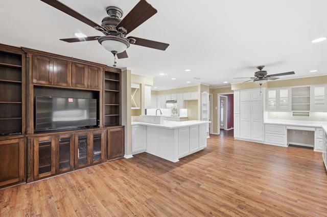 Renovations include an expanded den with a tv or reading area, a wall of glass with sliding doors leading to a covered patio. A built-in wall of cabinetry, pantry storage, and a built-in desk, all part of the open design with kitchen and eat-in area for comfort and function. The kitchen has been updated with Corian countertops.