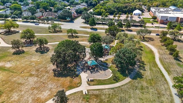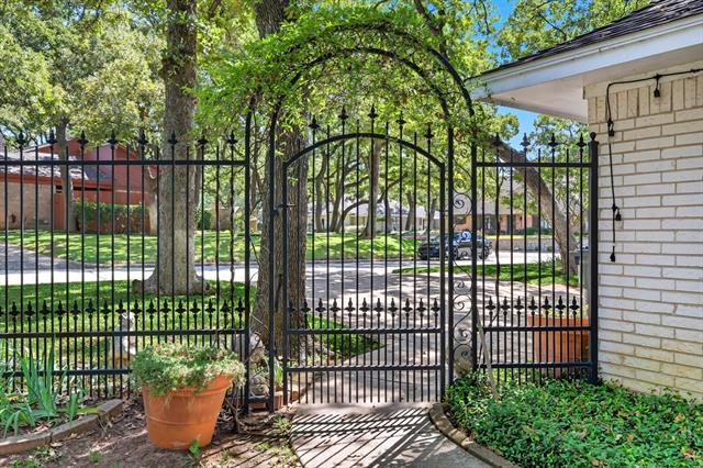 The primary suite offers a spacious ensuite bath featuring three closets, dual vanities, and a walk-in shower where a marble tub once stood. A private door leads from the suite to the home’s most stunning feature — the covered back patio, designed as an elegant extension of the home with a canopy roof that allows soft natural light to filter through. Beyond the custom iron gate of the patio, the backyard feels like your own private park.