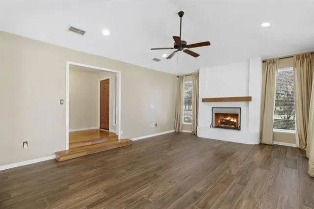 Inside, the spacious living room serves as the true heart of the home, highlighted by tall windows, abundant natural light, recessed lighting, and beautiful wood-look tile flooring. A cozy wood-burning fireplace anchors the space, creating the perfect setting for relaxing evenings or gathering with family and friends. The bar area and sunlit dining space flow effortlessly into the living area, offering an open, connected layout ideal for both everyday living and entertaining.