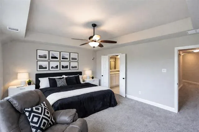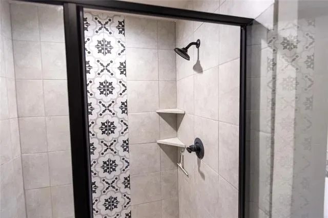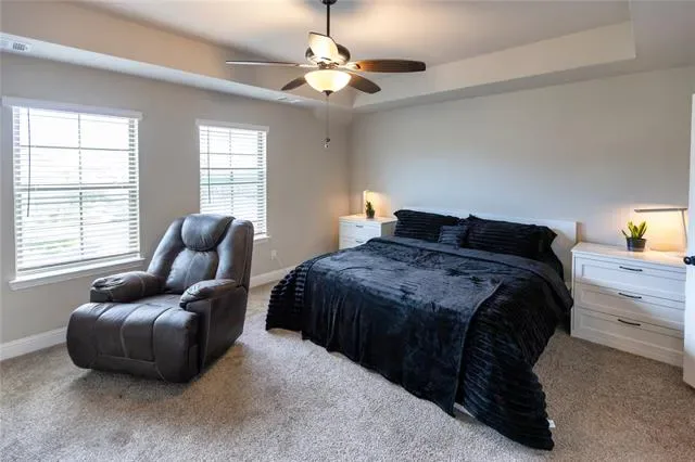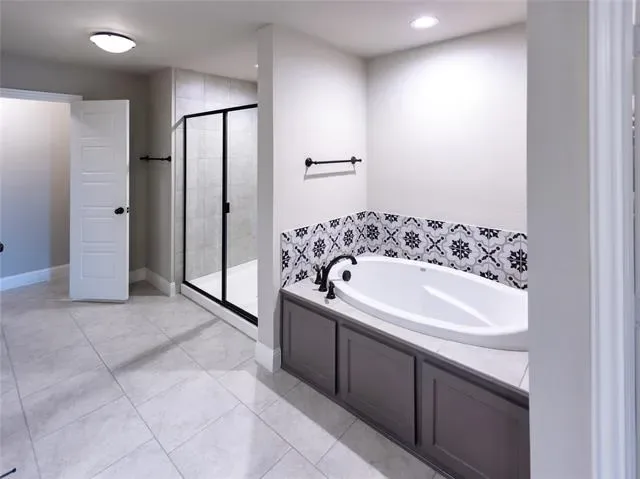 The oversized primary bedroom offers plenty of space for comfort and flexibility, along with a spa-like ensuite featuring a garden tub with decorative tile surround and a separate shower accented with matching decorative tile for a cohesive and elegant design.