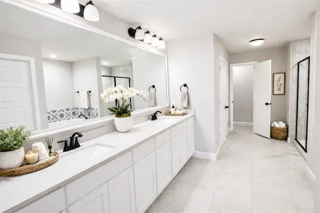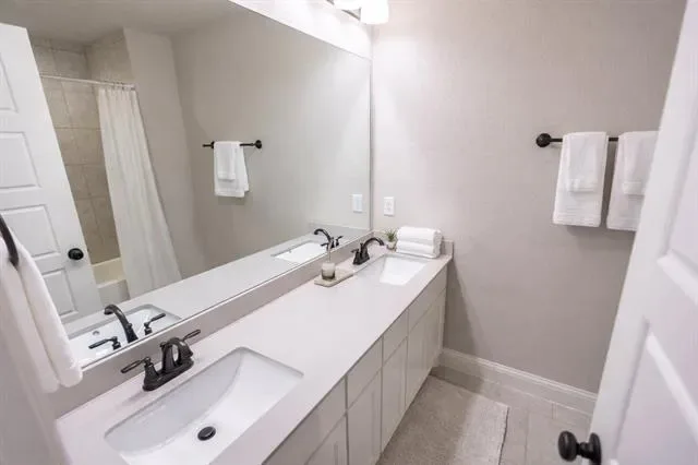 The secondary bathroom is designed with a spa-like ambiance, complete with dual sinks, decorative flooring, and a tub-shower combination.