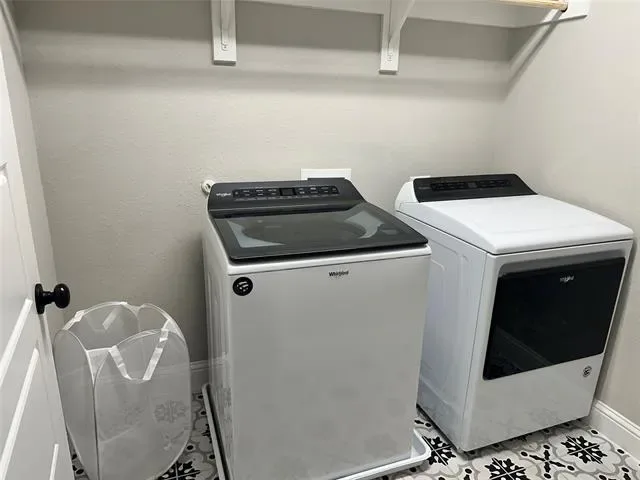 The kitchen is a standout with granite countertops, stylish light gray hexagon subway tile backsplash, and elegant white cabinetry. Equipped with stainless steel Whirlpool appliances, including a smooth-top range and built-in microwave, this space is both sleek and practical. Decorative tile accents and quality finishes add a refined touch throughout.