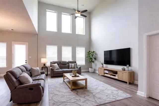 The spacious living area showcases dramatic ceilings and abundant windows, creating an inviting atmosphere.