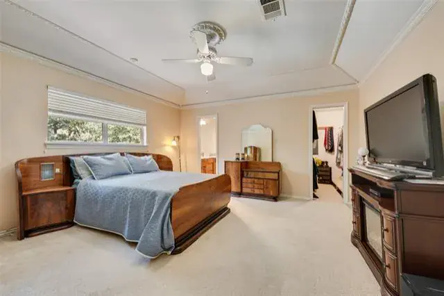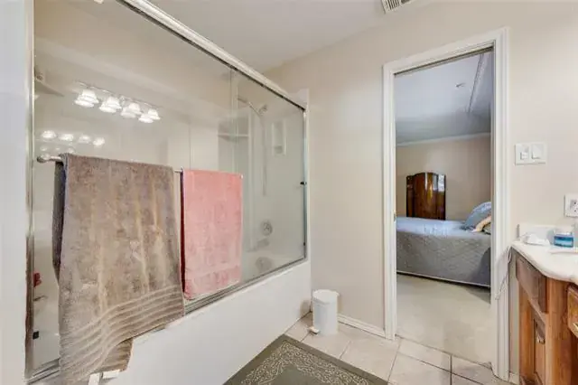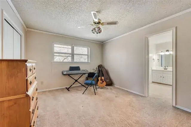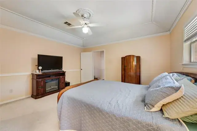 The large primary bedroom boasts vaulted ceilings, elegant crown molding, a generous walk-in closet, and a relaxing jetted tub in the ensuite bath. A second downstairs bedroom with its own attached bathroom provides convenience and flexibility. Renovated in 2025, the upstairs offers two additional bedrooms connected by a Jack-and-Jill bathroom with dual sinks, two sizable walk-in closets, and full-length mirrors—an ideal retreat for kids. Storage is abundant throughout the home, including a hallway leading to the garage with a half bath and a separate laundry room, thoughtfully tucked away from main living areas. The backyard is a private oasis featuring a refreshing pool shaded by mature trees—perfect for hot Texas summers. There’s plenty of patio space for seating and BBQs, plus a shed for yard equipment or extra storage. As an added bonus, the roof is only five years old. This charming property blends comfort, style, and functionality—ready to welcome you home.