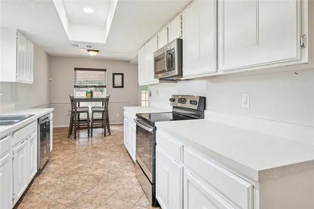 Kitchen is light and bright with stainless appliances and breakfast room overlooking backyard.