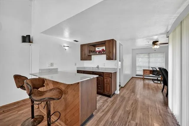 Step inside to a light-filled living room featuring soaring vaulted ceilings, wood-style flooring, and a striking floor-to-ceiling accent wall that creates an immediate “wow” factor. The cozy brick fireplace anchors the space, while the open layout flows seamlessly into the dining and kitchen areas—ideal for both everyday living and entertaining.