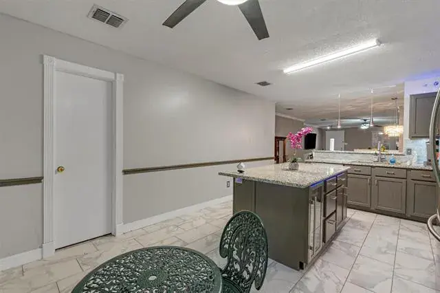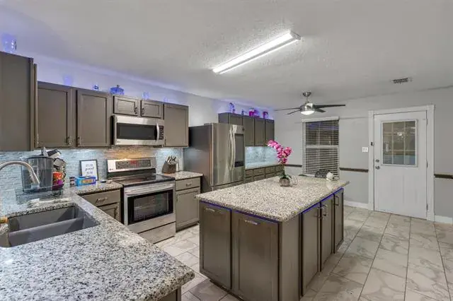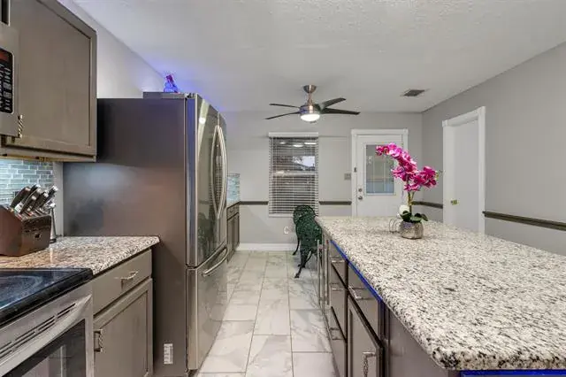 Step inside to fresh, neutral paint and a spacious family room with a cozy fireplace, seamlessly flowing into an open-concept kitchen—ideal for everyday living and entertaining. The kitchen has been thoughtfully updated with granite countertops, stainless steel appliances, stylish backsplash, modern lighting, a center island, and a built-in wine cooler. An abundance of cabinetry and generous cooking space make this kitchen a dream for chefs and home cooks alike. A walk-in pantry and utility room combo adds extra storage and efficiency, while smart Wi-Fi lighting enhances comfort and control throughout the home.