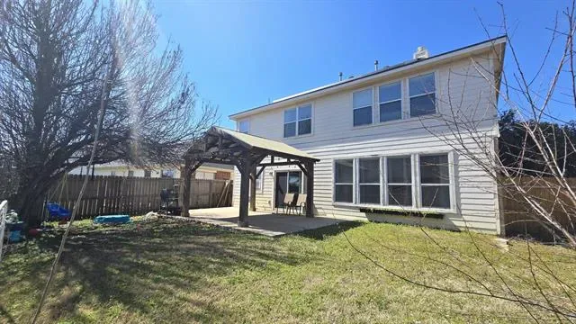 The interior layout places all bedrooms on the second floor, along with a dedicated game room. The first floor includes the main living areas, consisting of the kitchen, living room, dining area, laundry room, and a half bath. The backyard includes a pergola structure, offering covered outdoor space.