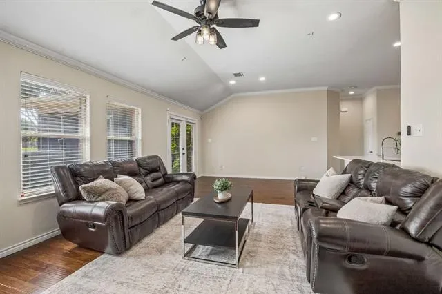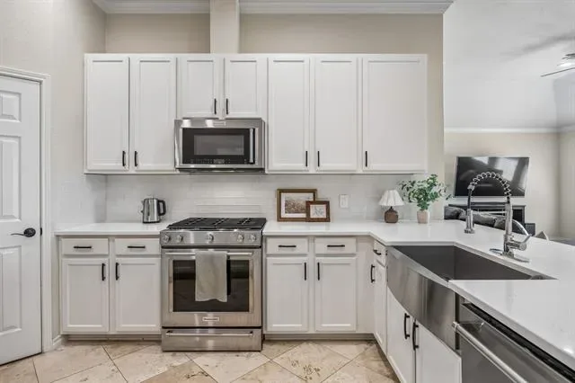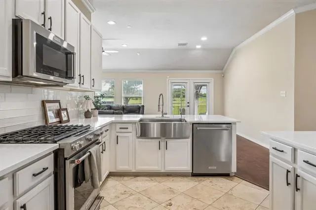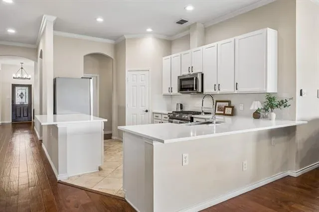 Step inside to discover a spacious, open floor plan accented by engineered hardwood floors flowing throughout the home. The kitchen features gleaming quartz countertops, stainless steel appliances, a farm sink, and a pre-wired surround sound system for added convenience.