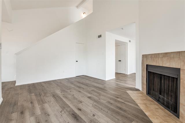 Soaring vaulted ceilings, a tile fireplace, and wide-plank LVP flooring anchor the light-filled great room. The remodeled kitchen features white shaker cabinets, marble-veined quartz countertops, matte-black designer hardware.