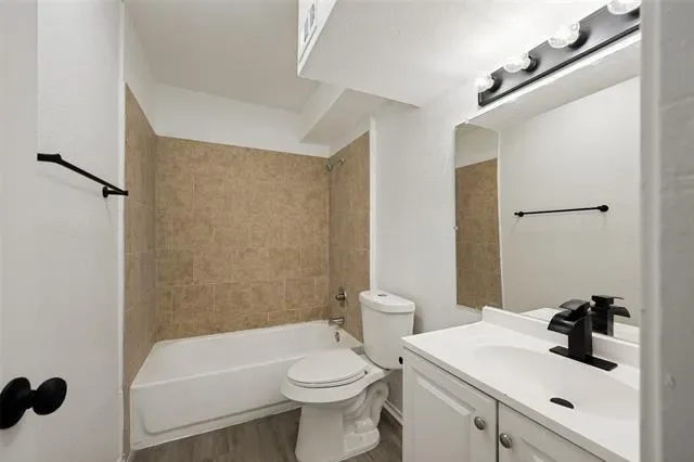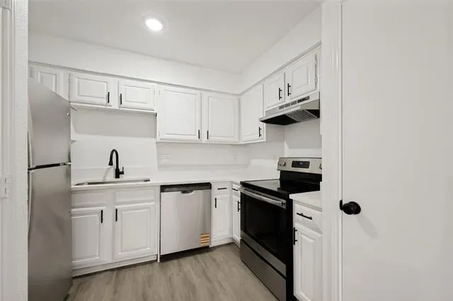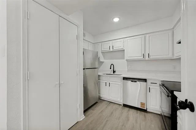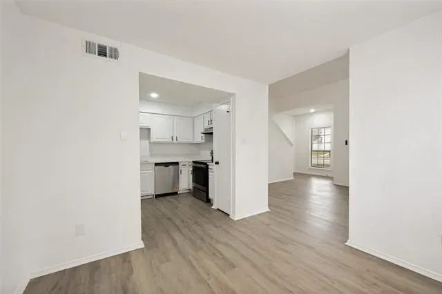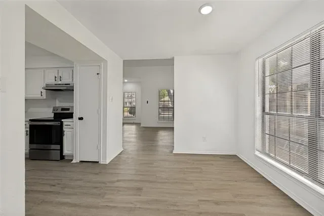 Bright and refreshed Arlington home with mature shade trees, inviting curb appeal, and a clean, move-in-ready interior. The main living area features vaulted ceilings, wood-look flooring, abundant natural light, and a cozy fireplace. The kitchen offers white cabinetry, updated countertops, black hardware, stainless steel appliances, and a functional layout connecting easily to the dining and living spaces. Spacious bedrooms include neutral finishes and updated ceiling fans, while the bathrooms feature refreshed vanities, fixtures, and tub-shower areas. Enjoy a private fenced patio plus rear covered parking with a two-car carport. Convenient location near major roads, shopping, dining, and area amenities.