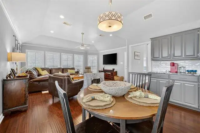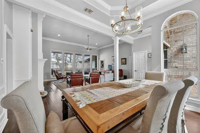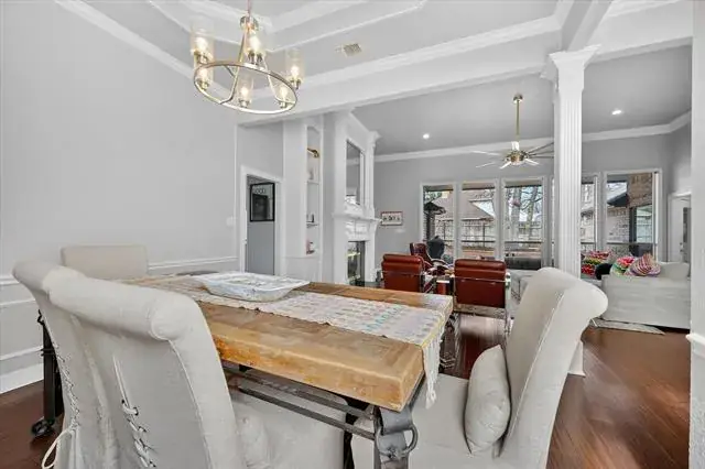 The eat-in kitchen opens to a spacious second living area, creating a flexible layout perfect for gatherings or relaxed daily living. A stunning great room features soaring ceilings, a floor-to-ceiling fireplace mantel, and built-in cabinetry adjacent to the formal dining area.