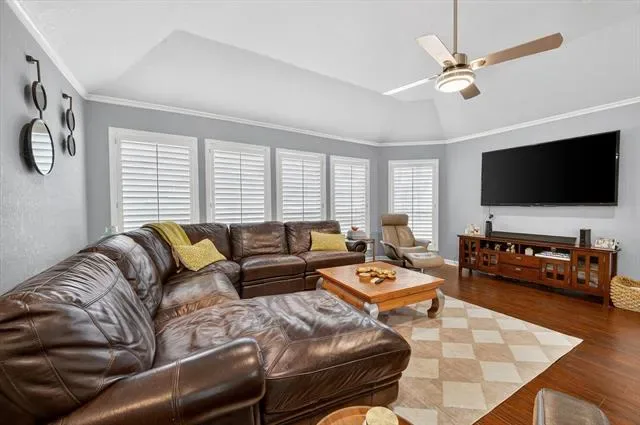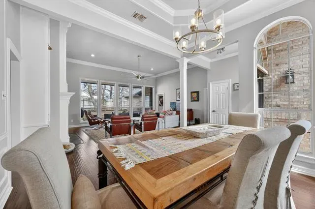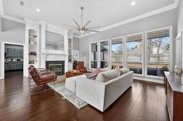 The eat-in kitchen opens to a spacious second living area, creating a flexible layout perfect for gatherings or relaxed daily living. A stunning great room features soaring ceilings, a floor-to-ceiling fireplace mantel, and built-in cabinetry adjacent to the formal dining area.