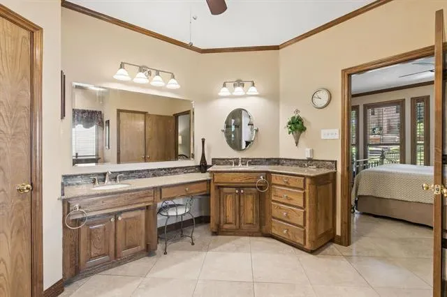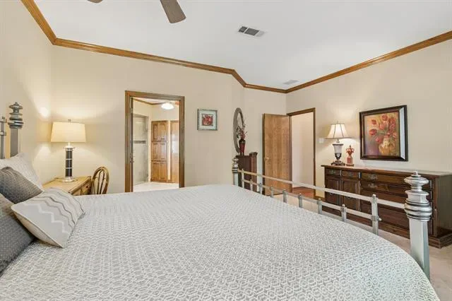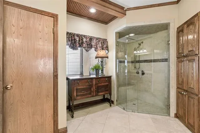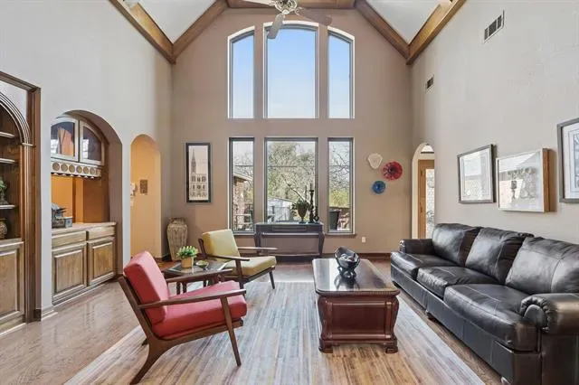 Situated on a quiet, tree-lined lot backing to a greenbelt, this highly custom 4-bedroom, 3 full bath two-story home offers exceptional craftsmanship, functional design, and long-term value. The exterior showcases mature landscaping, an electric gate for secured driveway access, and a private backyard retreat featuring a swimming pool with dual waterfall features. Inside, the home is defined by extensive wood trim, detailed molding, and a striking exotic custom front door that sets the tone upon entry. The well-designed floorplan includes two bedrooms on the first level, ideal for multigenerational living or guest accommodations, along with two dining areas and three spacious living areas. A dramatic main living space features soaring ceilings, exposed wood beams, and abundant natural light. The kitchen is appointed with granite countertops, custom cabinetry, stainless steel appliances, and a functional layout that opens to the main living areas. Hardwood flooring extends throughout the first floor, with tile in all wet areas for durability. The primary suite and secondary baths have been thoughtfully updated, offering modern finishes and a spa-like feel. Additional highlights include a full irrigation system and French drains to maintain optimal soil moisture, foundation stabilization completed in 2024 with a transferable warranty, and a new roof installed in December 2025. This all-electric home has been meticulously maintained and reflects pride of ownership throughout.