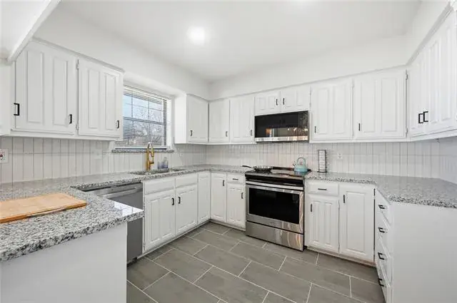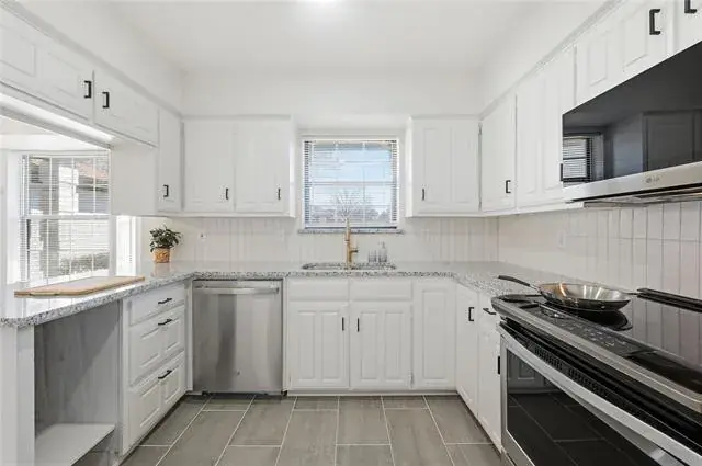 Upon entry, you are greeted by vaulted ceilings and expansive windows in the living area, creating a bright and inviting atmosphere filled with natural light. The kitchen is both stylish and functional, featuring a breakfast bar, new granite countertops, contemporary backsplash, and stainless steel appliances.
