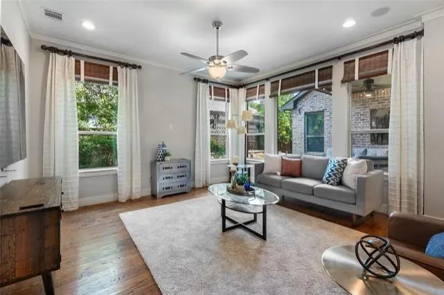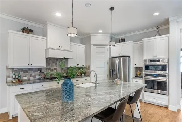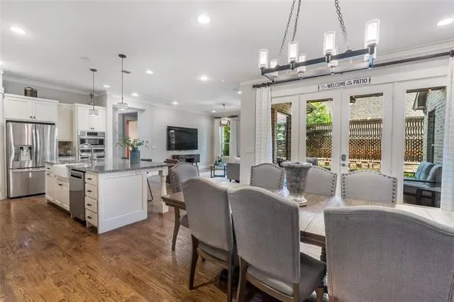 The main level boasts a gourmet kitchen with a large granite island, farmhouse sink, stainless steel appliances, and abundant cabinetry. The kitchen flows seamlessly into the dining and living areas, framed by walls of windows overlooking the backyard. Wood floors, designer lighting, and custom built-ins elevate the space for both entertaining and everyday living.
