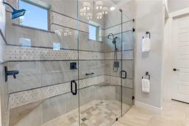 The private study features rich wood cabinetry, bookshelves, and beamed ceiling accents—ideal for working from home. The primary suite offers a serene retreat with a tray ceiling and spa-inspired ensuite showcasing dual vanities, abundant storage, and a frameless walk-in shower with dual shower heads.
