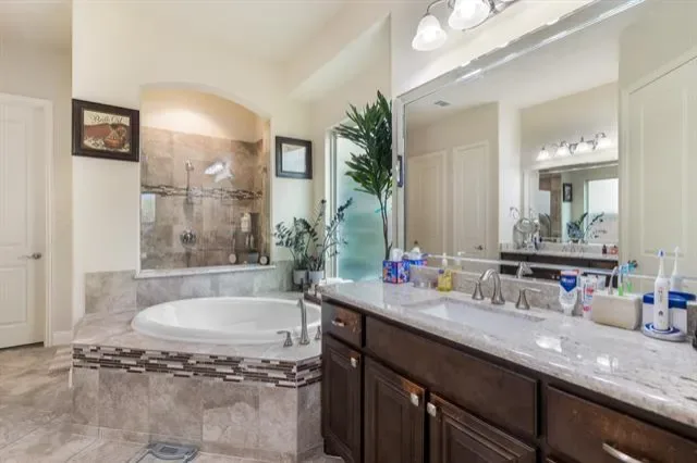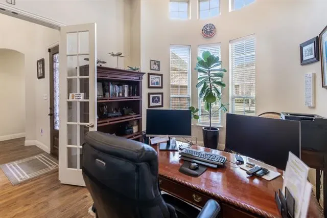 The private primary suite offers a relaxing retreat with a spa-inspired bath featuring separate vanities, a soaking tub, an oversized walk-in shower, and two generous walk-in closets—one of which connects directly to the laundry room, making laundry days effortless. A dedicated home office with French doors and a shelved closet provides an ideal work-from-home space.