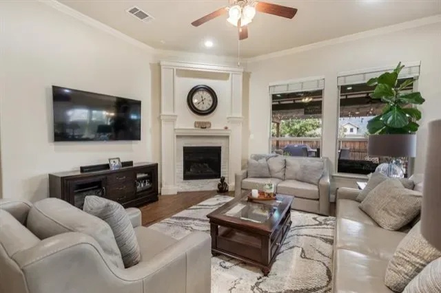 The chef’s kitchen is the centerpiece of the home, featuring a large granite island, stainless steel appliances, abundant cabinetry, stylish pendant lighting, and a butler’s pantry that doubles perfectly as a coffee bar for easy morning routines. The kitchen flows seamlessly into the spacious living area, where a fireplace and walls of windows overlook the backyard—ideal for both everyday living and entertaining.