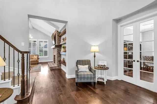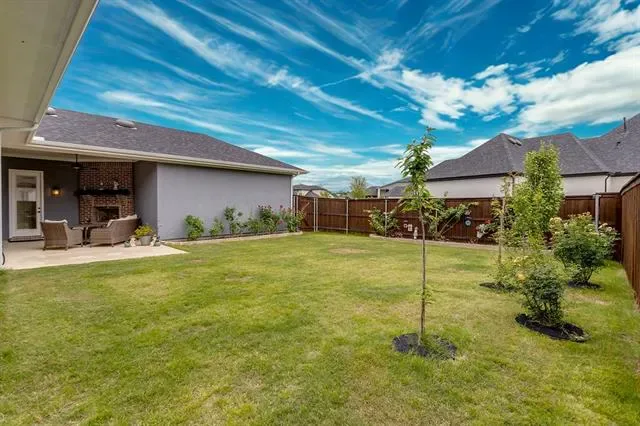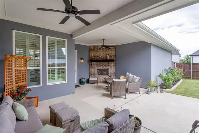 Step outside to a covered patio with a cozy fireplace, creating a relaxing outdoor retreat.