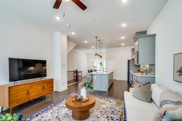 The second floor is filled with natural morning light and offers an open-concept kitchen, dining, and living space that flows effortlessly for everyday living and entertaining. A convenient half bath is also located on this level.