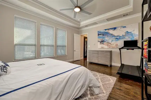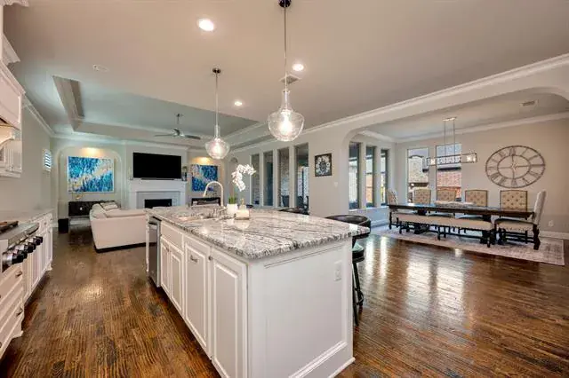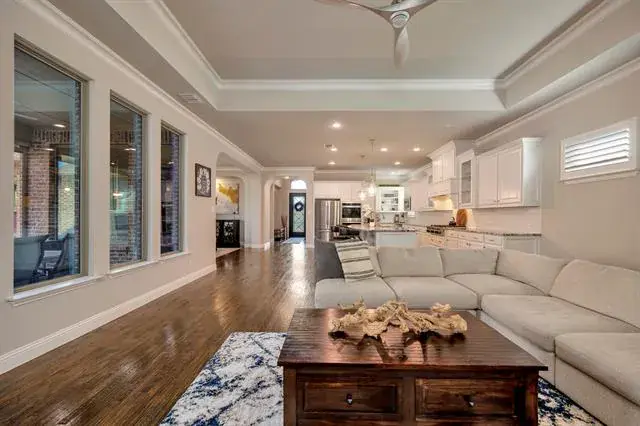 Experience a rare masterpiece of luxury and function, including a stunning outdoor living space, in this single-story home just steps from lakes and trails in Arlington’s premiere Viridian community. The meticulously designed, chef-inspired kitchen offers double ovens, custom cabinetry, including spice-racks above the gas cooktop, granite countertops, and a large center island with breakfast bar. The thoughtful layout includes hand-scraped wood floors throughout the defined dining room and expansive living area, which features a fireplace and elegant tray ceiling. Step outside to a covered patio equipped with custom remote-controlled shades as well as a showstopping fireplace, offering a year-round sanctuary designed for elevated gatherings or quiet evenings. Escape to the spa-inspired primary ensuite with soaking tub, massive separate shower with dual shower heads, opposing vanities. For added convenience, expansive walk-in closets have direct access to the laundry room. This beautiful home is loaded with high-end finishes, modern efficiency, including glass and steel entryways with biometric Lockley keypad, automated Leviton uplighting, an epoxy-coated, 3-car garage with MyQ openers, upgraded attic AC sensors, and tankless water heaters, and professionally installed, low-maintenance turf in the backyard. The community offers 24-hour security, resort-style pools, tennis and pickleball courts, a dog park, and easy access to the Lake Club and Sailing Center. Easy access to top shopping, dining, entertainment, and major highways.