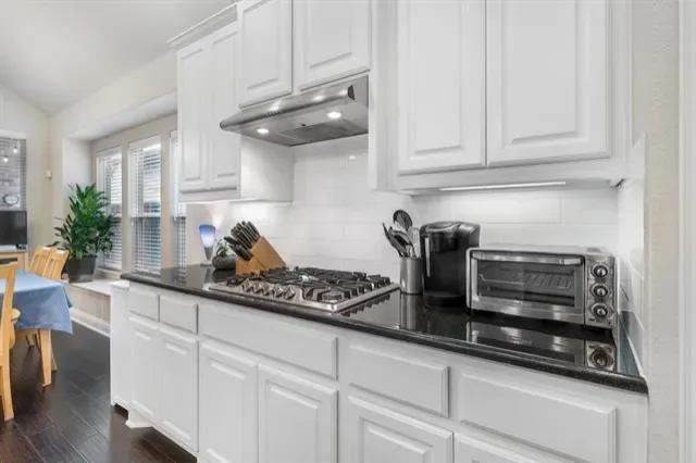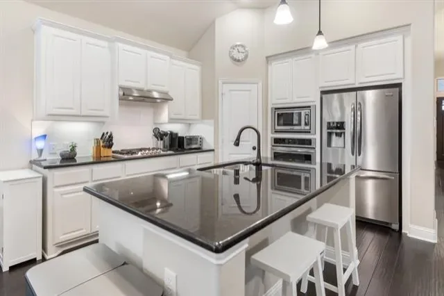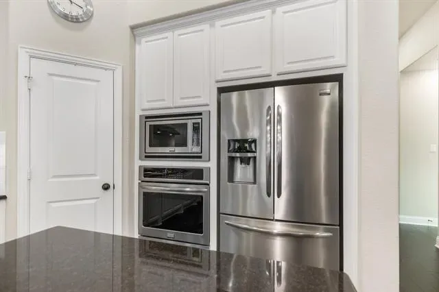 The kitchen showcases crisp white cabinetry, granite countertops, a large island with seating, stainless steel appliances, 5 burner gas cooktop, built-in microwave and oven, and a walk-in pantry. Pendant lighting and recessed lights enhance the bright, clean design.