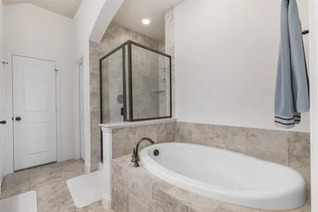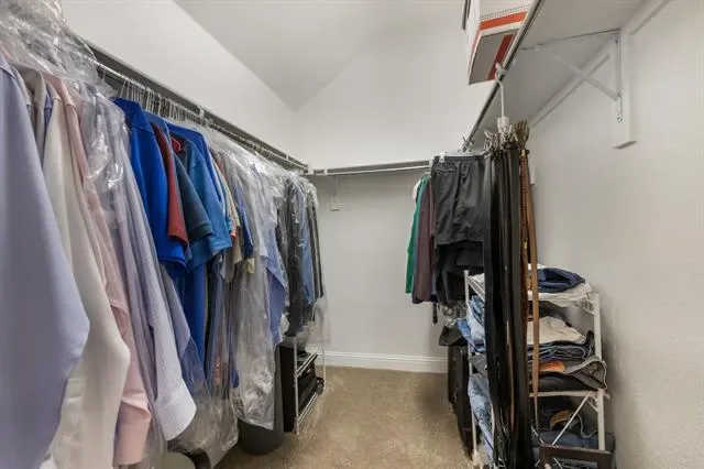 The private primary suite offers vaulted ceilings, plush carpet, and a spa-inspired ensuite bath with dual vanities, large mirrors, a jetted tub, oversized glass-enclosed shower, a linen and generous walk-in closet.