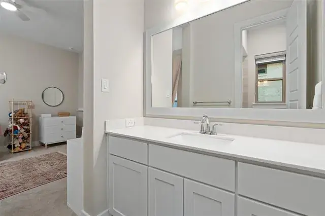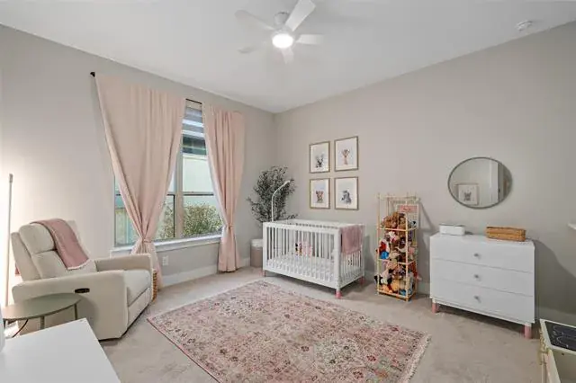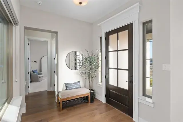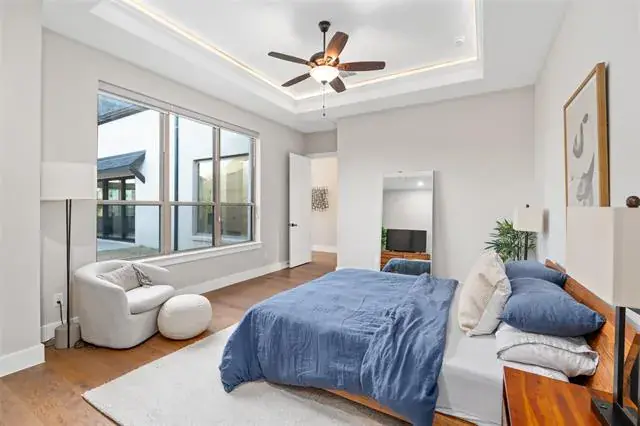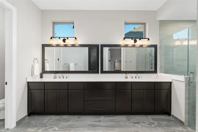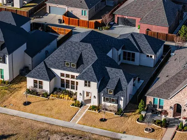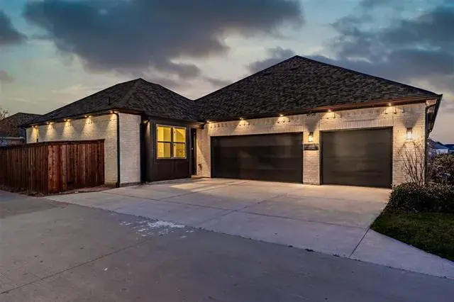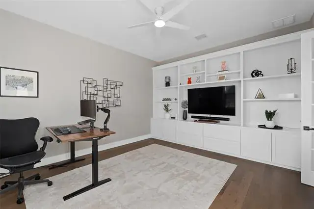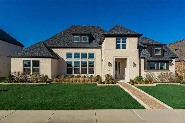 Elevated design meets effortless indoor-outdoor living in this stunning custom home, ideally positioned on a premium lot just minutes from scenic walking paths, the lake, and the community center. From the moment you step inside, the dramatic 16-foot ceilings, exposed beams, and walls of windows create a light-filled showpiece, anchored by a striking floor-to-ceiling stacked stone electric fireplace. Rich wood flooring flows through the main living areas, while expansive three-panel sliding doors seamlessly connect the interior to your private outdoor retreat. The courtyard-style backyard is built for entertaining, featuring an oversized covered patio with built-in grill and prep counter, ambient lighting, and a cozy gas fire pit—perfect for gatherings in every season. At the heart of the home, the chef’s kitchen impresses with double ovens, gas cooktop with pot filler, abundant cabinetry, and a massive quartz island with waterfall edges—designed for both everyday living and memorable hosting. The spacious primary suite offers a true spa experience with dual vanities, an oversized walk-in shower, and a glass-enclosed bathing area with dual rainfall shower heads, plus a custom walk-in closet. A private guest or mother-in-law suite with its own bath provides ideal flexibility, while two additional bedrooms share a generous Jack-and-Jill bath. The dedicated home office with glass French doors and built-ins creates the perfect work-from-home sanctuary. Additional highlights include a 3-car garage with EV charging station, smart home features, and enhanced exterior lighting for modern convenience and peace of mind. Living in Viridian means enjoying resort-style amenities including five lakes, miles of hike and bike trails, the Lake Club with pools and cabanas, sailing center, tennis and volleyball courts, playgrounds, dog parks, and year-round community events.