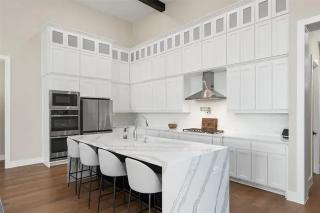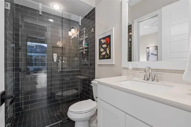 NEW REDUCED PRICE! Elevated design meets effortless indoor-outdoor living in this stunning custom home, ideally positioned on a premium lot just minutes from scenic walking paths, the lake, and the community center. From the moment you step inside, the dramatic 16-foot ceilings, exposed beams, and walls of windows create a light-filled showpiece, anchored by a striking floor-to-ceiling stacked stone electric fireplace. Rich wood flooring flows through the main living areas, while expansive three-panel sliding doors seamlessly connect the interior to your private outdoor retreat. The courtyard-style backyard is built for entertaining, featuring an oversized covered patio with built-in grill and prep counter, ambient lighting, and a cozy gas fire pit—perfect for gatherings in every season. At the heart of the home, the chef’s kitchen impresses with double ovens, gas cooktop with pot filler, abundant cabinetry, and a massive quartz island with waterfall edges—designed for both everyday living and memorable hosting. The spacious primary suite offers a true spa experience with dual vanities, an oversized walk-in shower, and a glass-enclosed bathing area with dual rainfall shower heads, plus a custom walk-in closet. A private guest or mother-in-law suite with its own bath provides ideal flexibility, while two additional bedrooms share a generous Jack-and-Jill bath. The dedicated home office with glass French doors and built-ins creates the perfect work-from-home sanctuary. Additional highlights include a 3-car garage with EV charging station, smart home features, and enhanced exterior lighting for modern convenience and peace of mind. Living in Viridian means enjoying resort-style amenities including five lakes, miles of hike and bike trails, the Lake Club with pools and cabanas, sailing center, tennis and volleyball courts, playgrounds, dog parks, and year-round community events.
