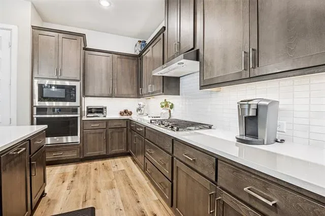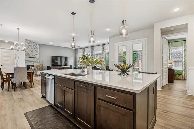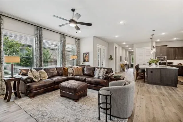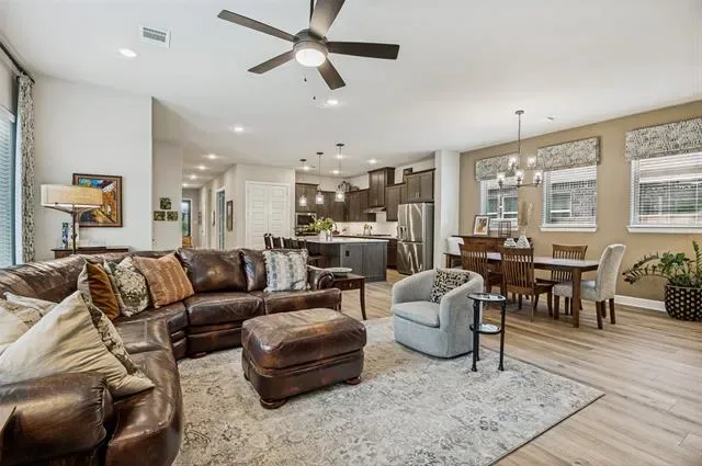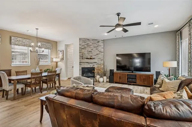Welcome to 4810 Emerald Grove, located in the highly desirable 55+ community of Viridian in Arlington. This beautifully upgraded 2-bedroom, 2-bath home with a dedicated office offers the perfect blend of comfort, style, and low-maintenance living. Thoughtfully designed, the home features an open and inviting layout with elevated finishes throughout, including upgraded flooring, countertops, designer lighting, and enhanced kitchen and bath hardware. The kitchen is both functional and stylish, complete with a convenient trash and recycling drawer and ample space for entertaining. The spacious primary suite is a true retreat, highlighted by a tray ceiling, custom drapery, and a well-appointed en-suite bath. Additional features such as framed mirrors and accent walls add a custom, high-end feel throughout the home. One of the standout features is the oversized, extended garage—offering a rare 7-foot extension with epoxy flooring, additional ceiling lighting, and ample room for a golf cart, workshop, or extra storage. A dedicated 9×9 storage nook adds even more flexibility. Enjoy outdoor living on the charming flagstone side porch or relax indoors by the striking Coronado stone fireplace, creating a warm and inviting focal point in the living area. A recirculating hot water system adds everyday convenience and efficiency. Located within the vibrant Viridian community, residents enjoy resort-style amenities, scenic walking trails, and a lifestyle designed for active adults. This is a rare opportunity to own a highly upgraded home in one of Arlington’s premier 55+ neighborhoods.