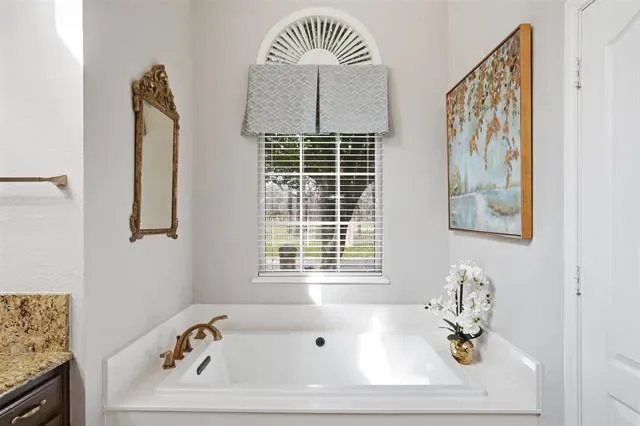 The home showcases classic, enduring finishes that create a warm and inviting atmosphere throughout. The primary bath serves as a relaxing retreat with a luxurious air bubble tub, perfect for unwinding at the end of the day. Recent improvements include a new AC system installed last year and a durable Class 4, 50-year roof, providing both efficiency and long-term peace of mind. Energy-saving solar screens on the front windows further enhance the home’s comfort and efficiency.