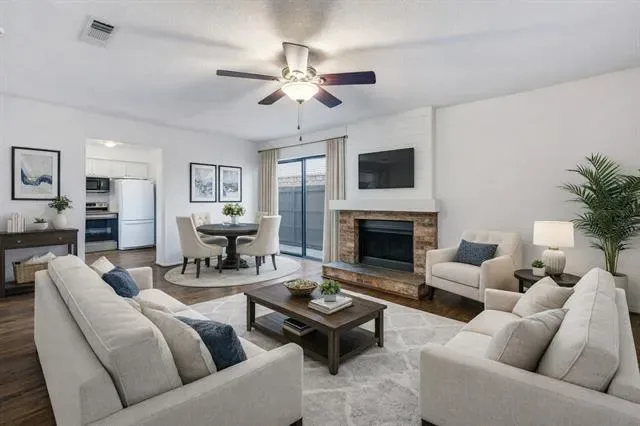 Welcome to this move-in ready 2-bedroom, 2.5-bathroom condo in the highly desirable Wellington Place community in North Arlington. Enjoy community amenities including a swimming pool and clubhouse, all within walking distance to the elementary school. You’ll also have easy access to shopping, dining, major highways, River Legacy Park, the Arlington Entertainment District, and UTA. Step inside to a bright, freshly painted unit with refinished wood flooring to the main living areas and new carpet. living room features a wood-burning fireplace. A powder bath is perfect for guests. The formal dining room flows to a kitchen with white painted cabinets, granite countertops, and stainless-steel appliances. A convenient laundry closet with stackable washer and dryer conveys with the sale. Upstairs, you’ll find a landing with built-ins for extra storage and two spacious bedrooms, each with en-suite bathrooms and walk-in closets. This home also includes an assigned covered parking space ‘S73’.