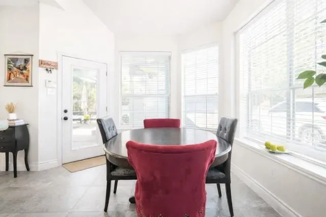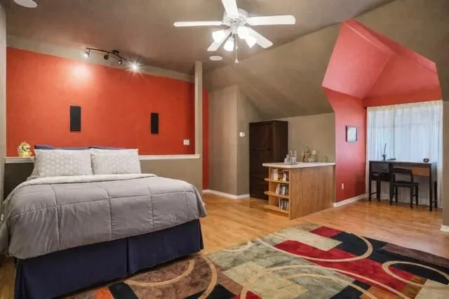 The primary suite is a true retreat with its own fireplace, sitting area, and direct access to the backyard. The spa-style bath features dual vanities, jetted soaking tub, and a seamless glass shower.