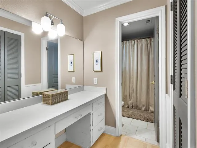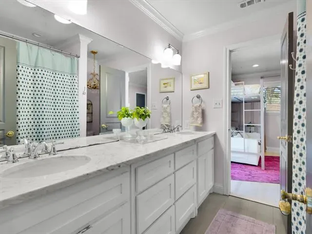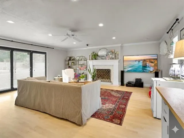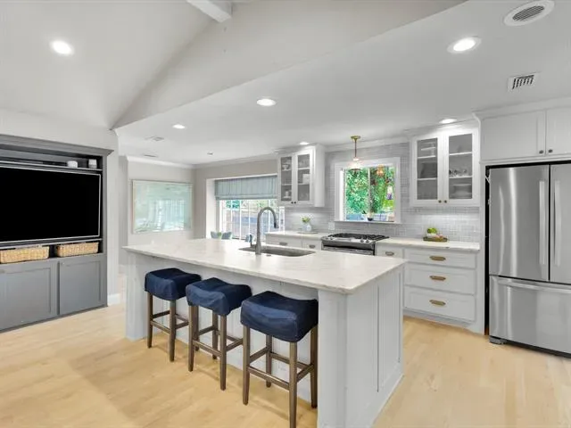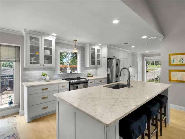 Inside, the home combines classic character with clean, modern updates. The kitchen features include solid wood custom shaker cabinetry, authentic Carrara marble countertops, a stainless steel gas range, and designer tile sourced from French Brown in Dallas. Vaulted ceilings with exposed wood beams and a stone fireplace add structure and warmth to the main living area.