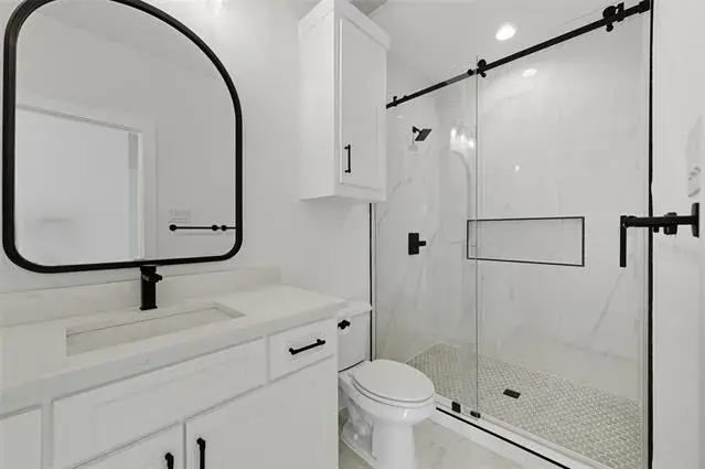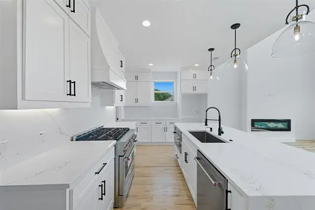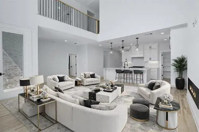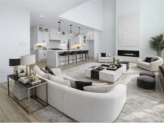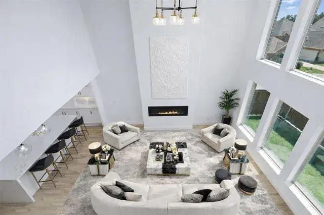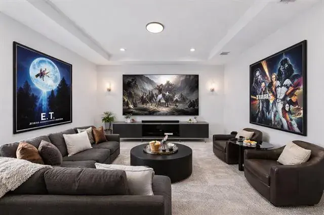 Designed for both leisure and functionality, this home offers two distinct living areas, including a oversize theater room to capture the immersive cinematic experience. The grand living room is defined by its soaring vaulted ceilings and an electric fireplace, creating a striking focal point. A chef’s dream kitchen features pristine Corian countertops and an island with a striking waterfall edge, complemented by custom cabinetry and high-end appliances. The home is further enhanced by modern, unique light fixtures that illuminate the space with sophistication.