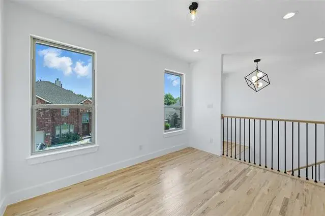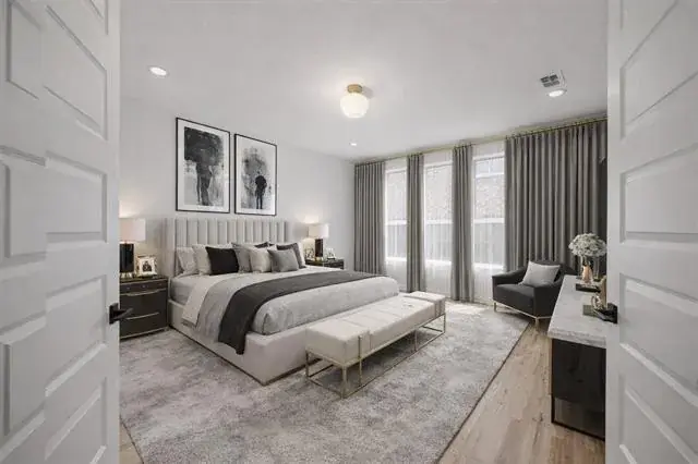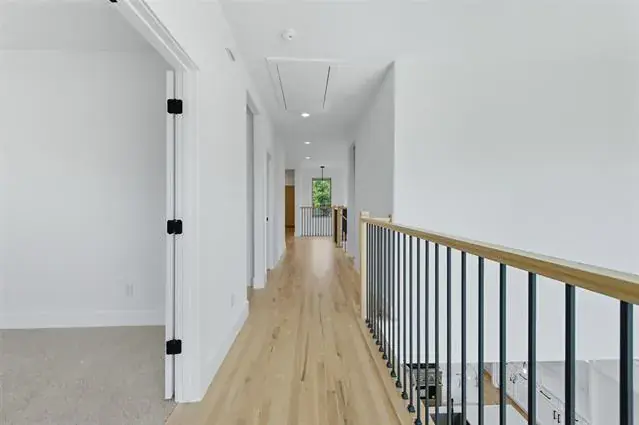 The upstairs also offers a dedicated craft or exercise room, as well as a built-in library desk, creating the perfect environment for both work and relaxation. The stunning hardwood floors, matched by a detailed banister with rod iron accents and integrated lighting within the steps, add warmth and elegance throughout. This home blends comfort, style, and innovation, making it the pinnacle of refined living.